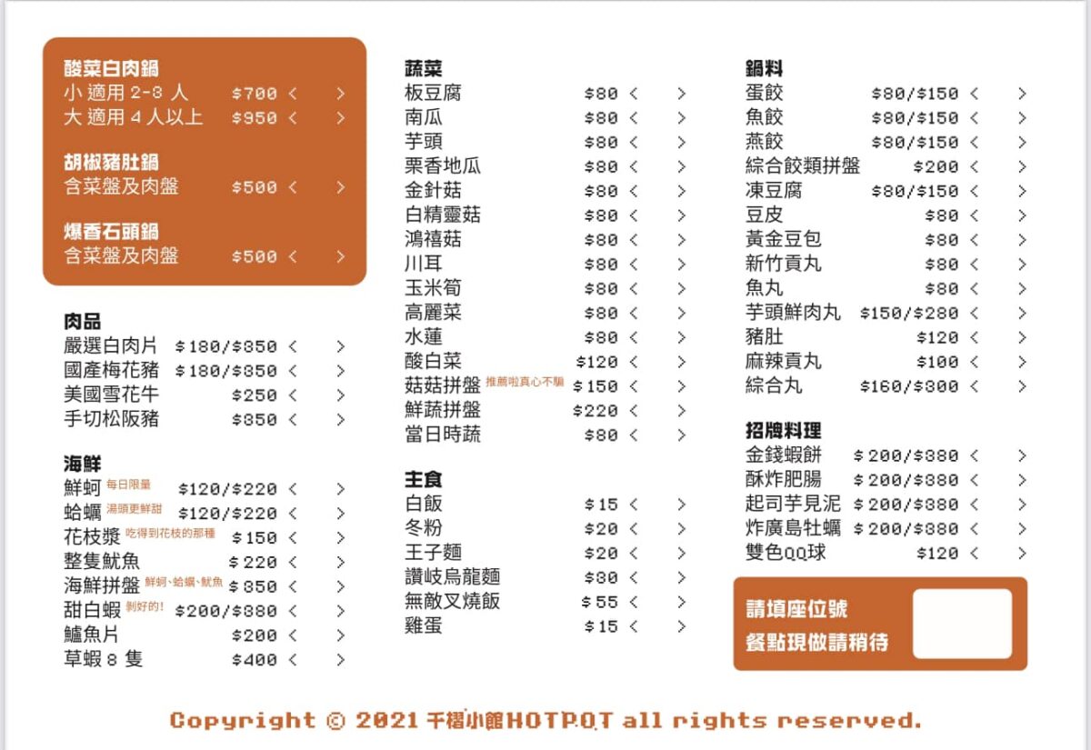 酸菜白肉鍋有二種size,小份以及大份這二種,前者價格是七百,後者是950元不收服務費