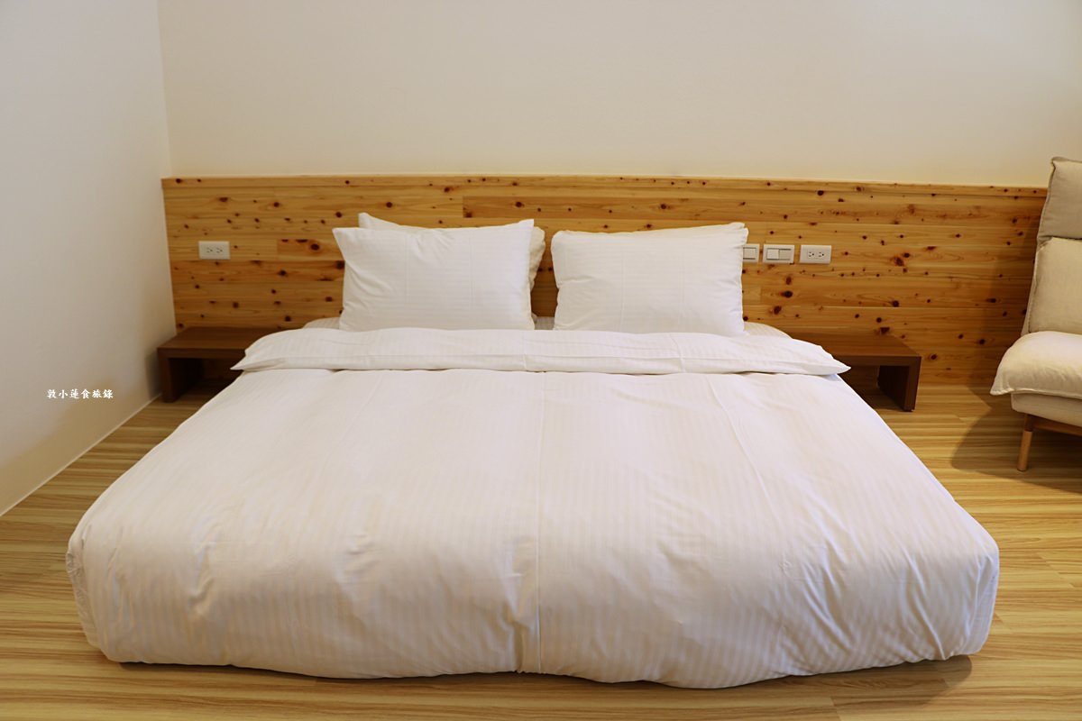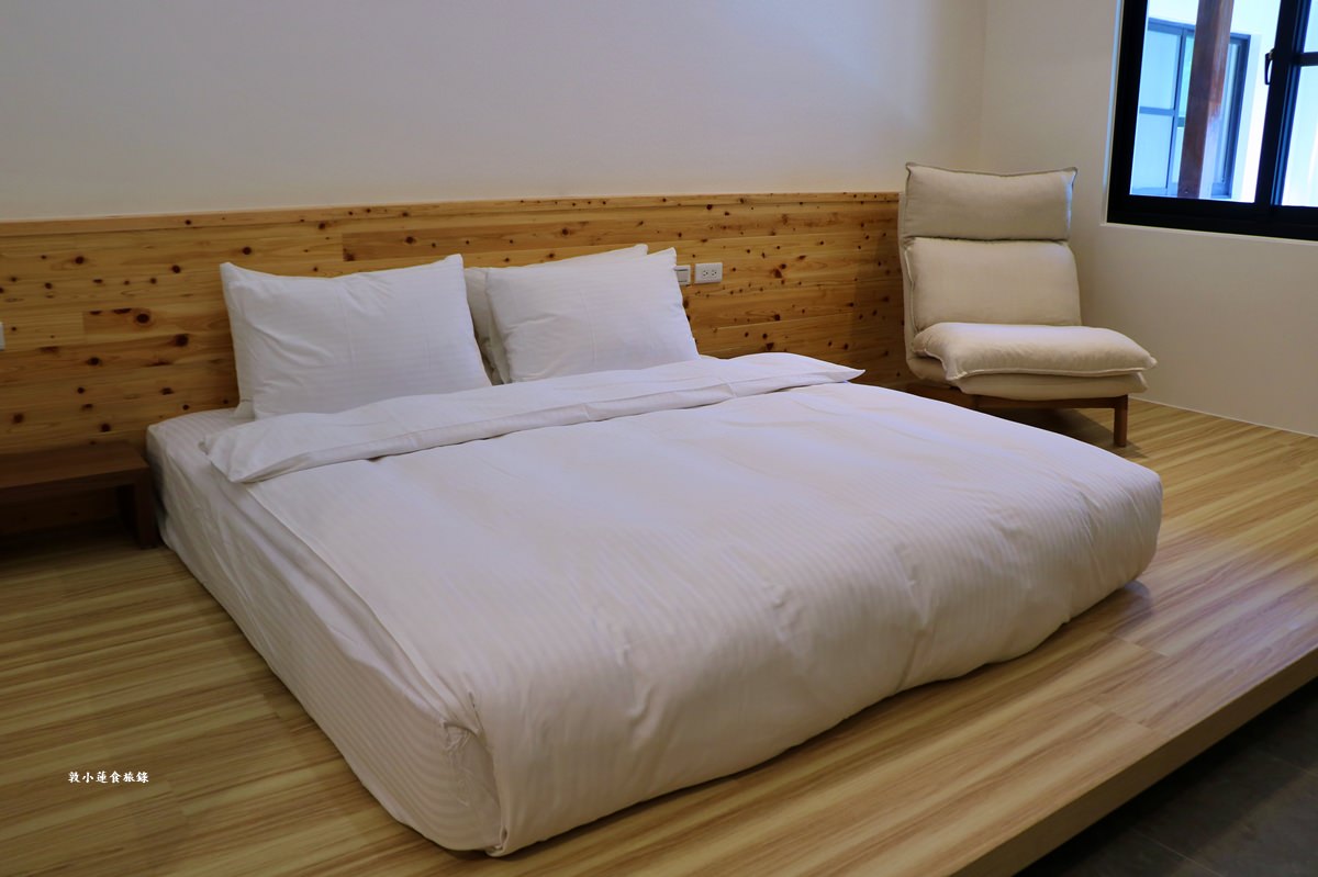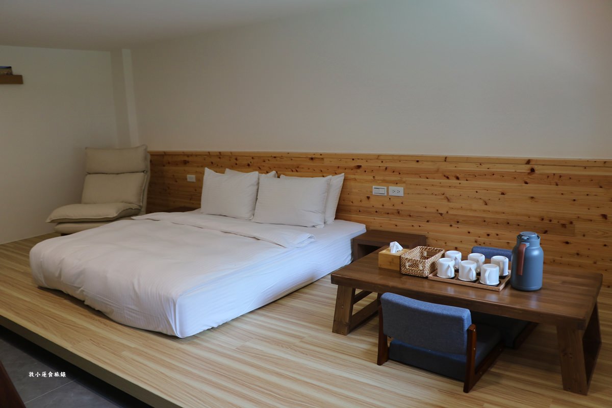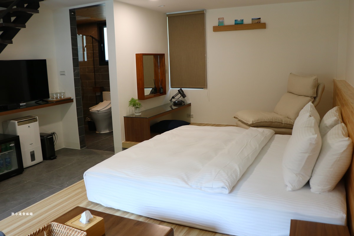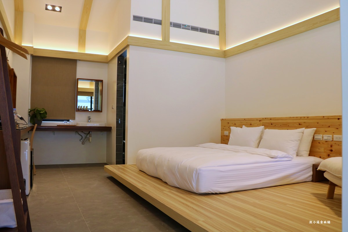 二人房8坪空間挺寬敞,挑高屋簷設計比較沒有壓迫感,旁邊有張軟墊椅,坐躺在上頭會不小心睡著
