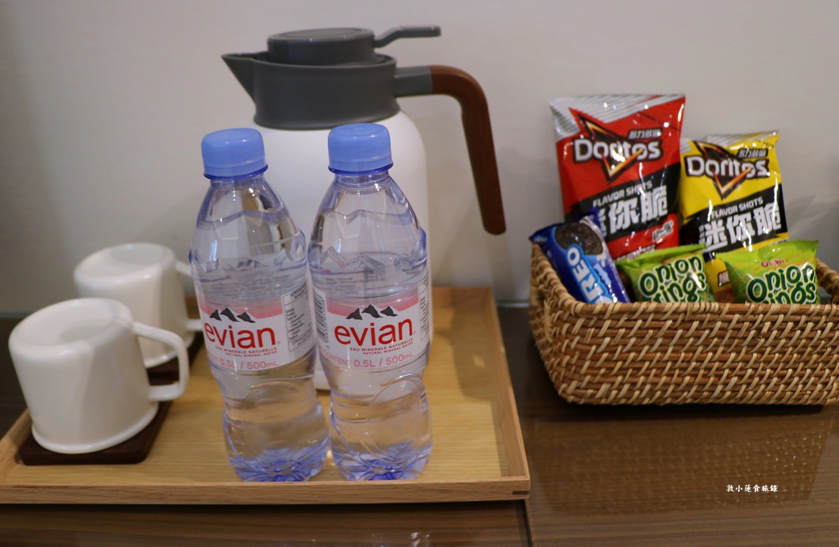 住過那麼多民宿和飯店,頭一次看到礦泉水選用法國Evian天然礦泉水