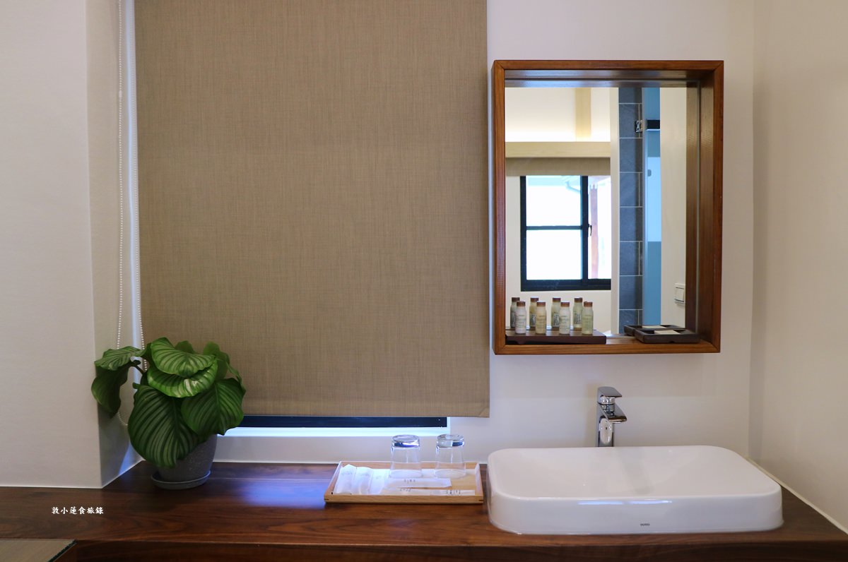 洗臉盆設置在外頭,房間內的除濕機、冷氣都在運轉,不用擔心洗臉台上的水漬會滴滿地,水漬(滴)很快就乾了
