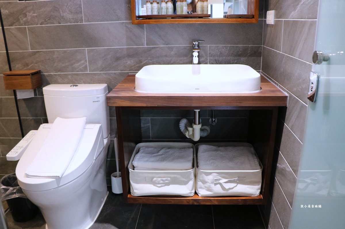 6人房的衛浴裝潢也跟其它房型不大一樣,洗臉盆是在廁所裡頭,大毛巾則放置在洗臉盆下方
