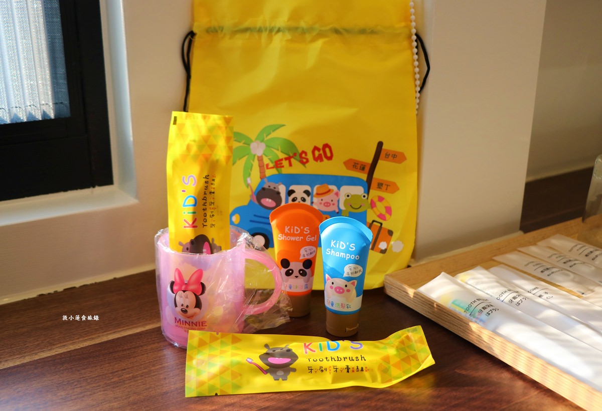 小孩另有兒童專用牙刷、牙杯和洗沐浴乳,外加一個超可愛的提袋,可以打包帶走喔