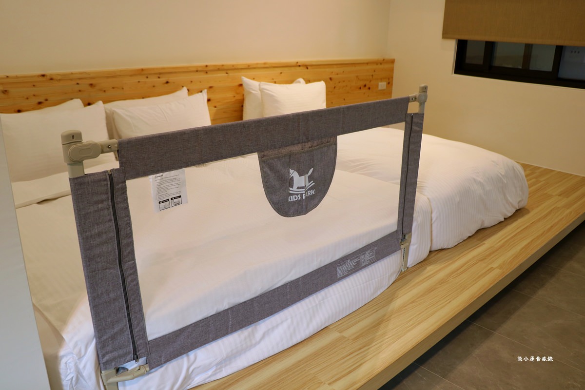 床底部裝設了床邊護欄,可避免小孩在床上玩的超開心不小心摔在木製板上