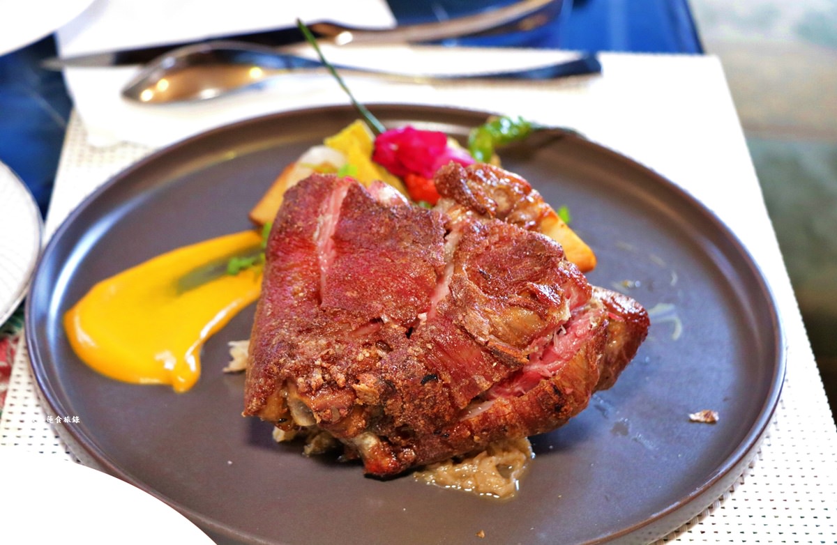 高溫爐烤的脆皮豬腳豬皮特別香脆,肉質切開還能看到肉汁在流動,豬皮很脆也很好劃開,底下的酸菜我個人覺得有點酸