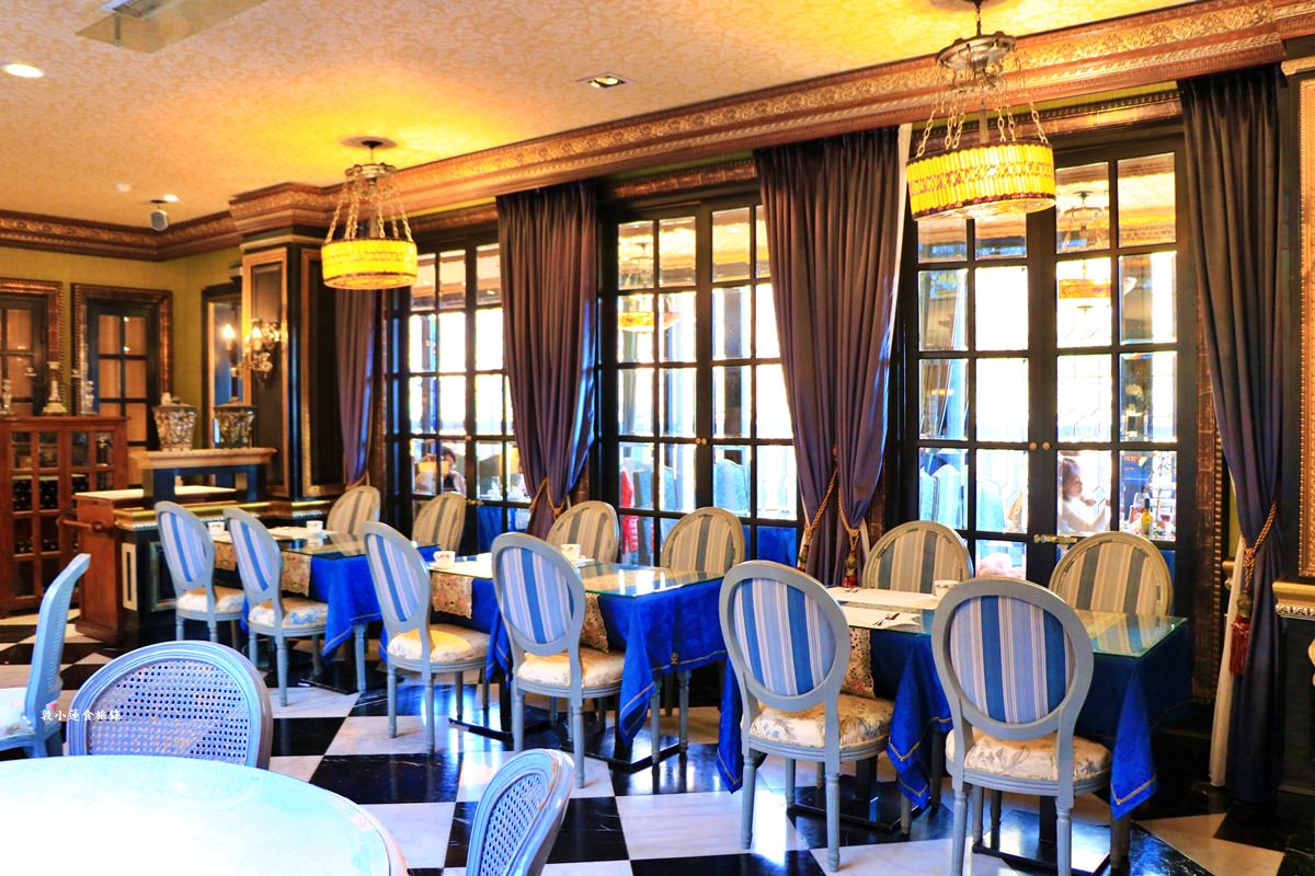維吉諾餐廳整體來說走的是英倫歐式風格,桌椅方面也是挺用心,靠窗這裡是藍白相間的花紋圓椅四人桌