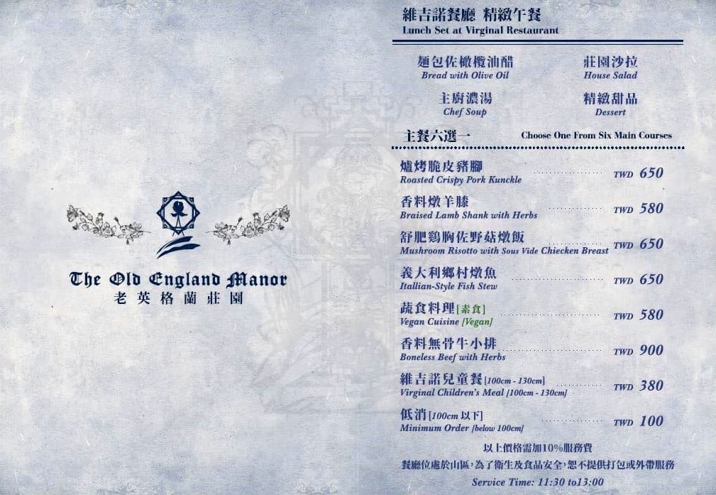 住不起老英格蘭莊園但維吉諾餐廳我還是吃得起,午餐580+10%起、下午茶350+10%起就能近距離欣賞非住宿區庭園風景