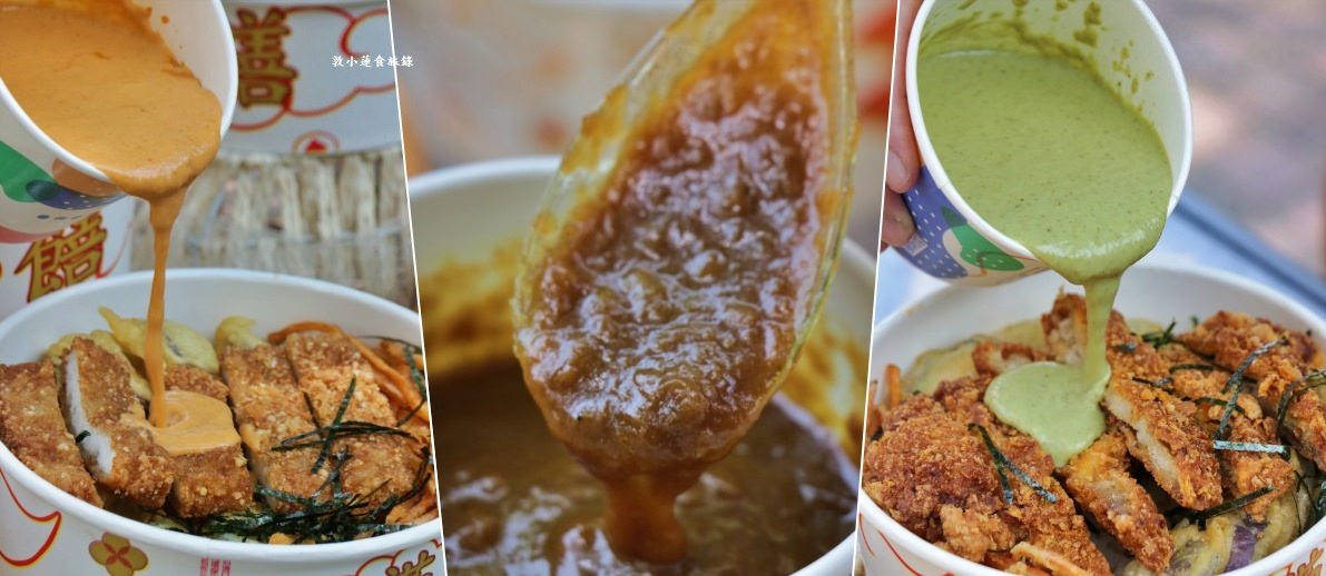 霸王三拼咖哩飯推薦給大食量的你,一碗咖哩飯有花枝、豬排、雞排三種主食