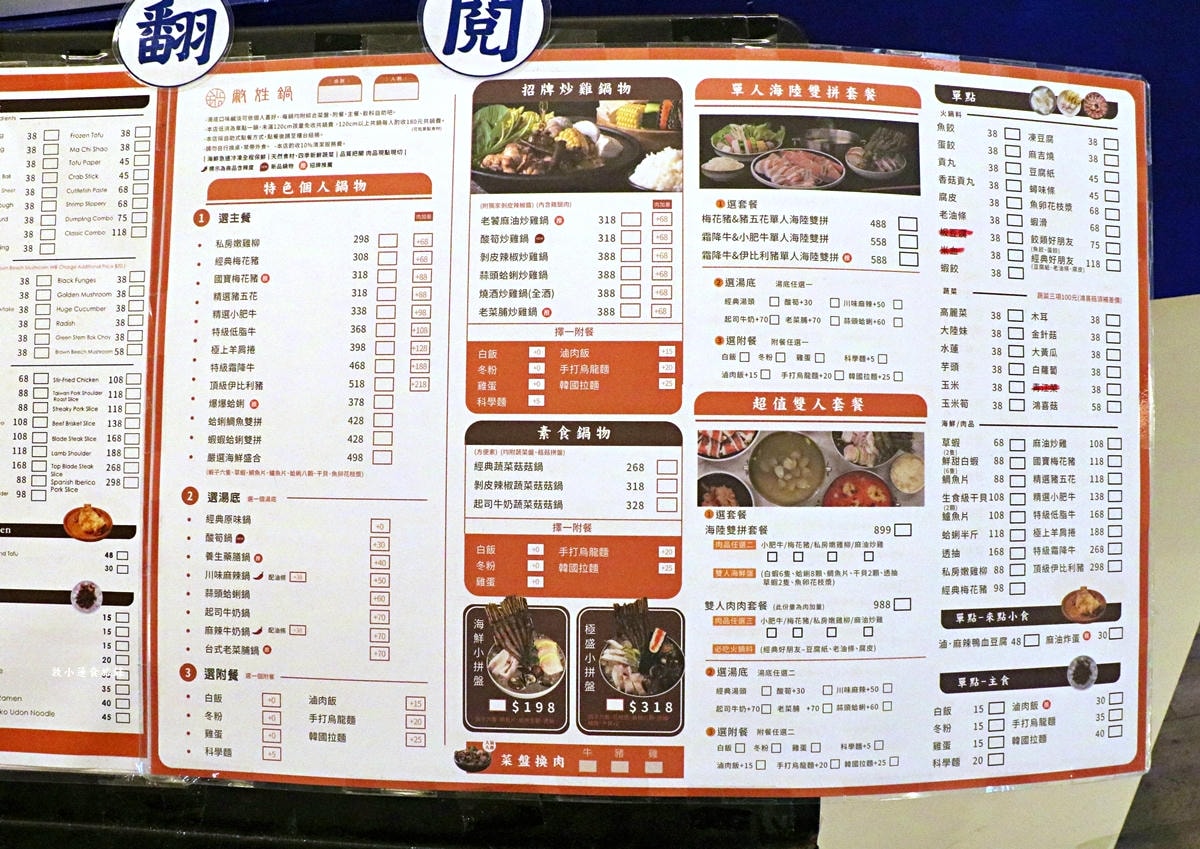 跟四年前相比價格漲浮許多,起碼漲了100元!!點餐方式很簡單先選鍋再選配料,最後挑副食